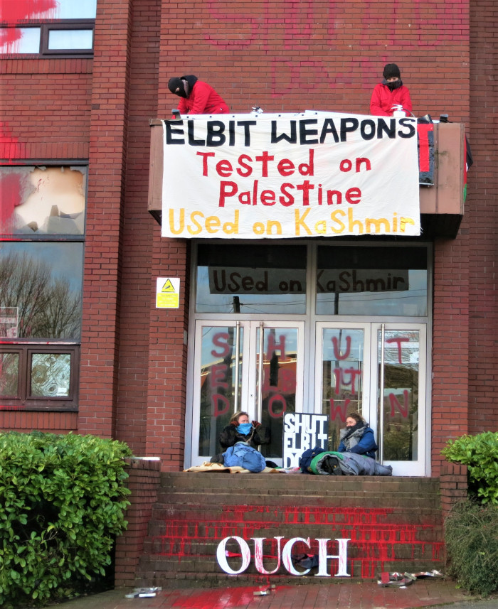 There were around 10 different actions targeting the site over 15 months, using a variety of tactics, and escalating in frequency and amount of damage. In the initial occupation in August 2020, people sprayed the premises in red paint symbolising the Palestinian bloodshed made possible by Elbit weapons. Later actions involved blockading the site entrance with vehicles or lock-ons. Lock-ons involve people using objects such as bike locks, handcuffs or arm tubes to secure themselves in place and prevent police from removing them easily. Protestors also scaled and occupied the roof, breaking windows and causing damage. In April 2021, activists gained entry to the factory itself and smashed the roof, windows and air vents, and covered equipment and computers in red paint. This caused £100,000 worth of damage and closed the site for a number of weeks. Another action in July 2020 caused £500,000 worth of damage.